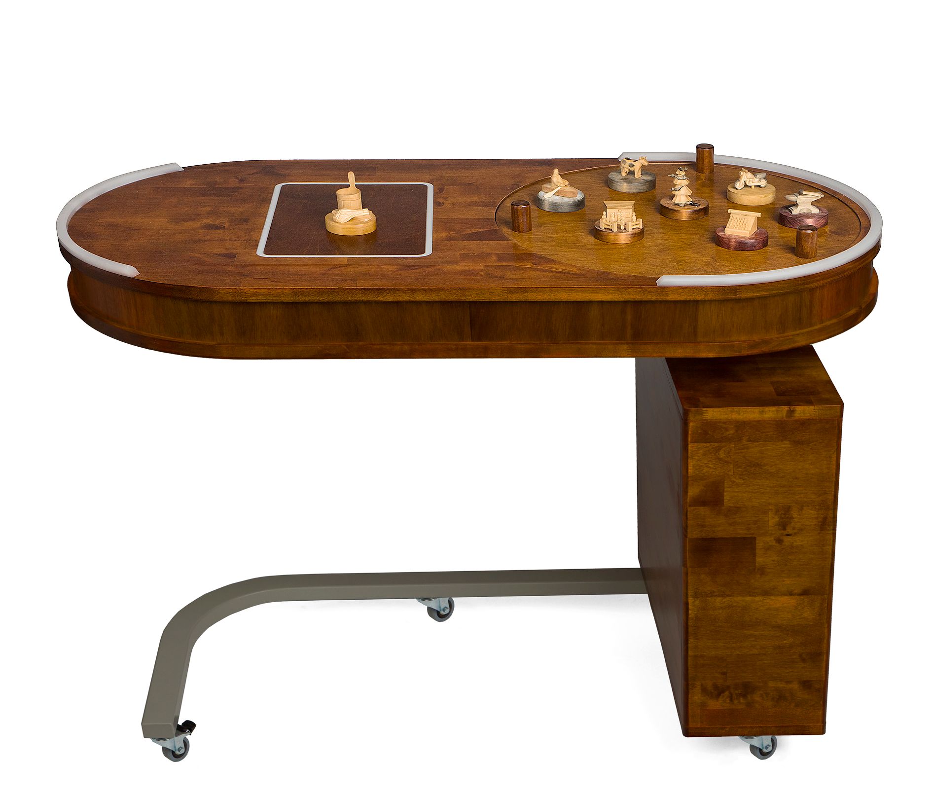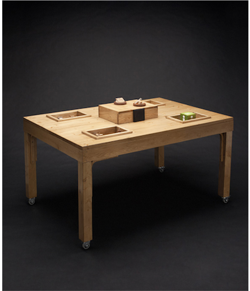 Äänimuseon versioiden 2 ja 3 pöydän kokoa pienennettiin siten, että vanhainkodin asukas saattoi tarvittaessa käyttää äänimuseota huoneessaan tai vuoteessaan (ks. kuva 3). Näistä pöytämallisista äänimuseoista saadussa palautteessa on kiitetty erityisesti sitä, että muistelutuokion ohjaaja pystyy rakentamaan äänien avulla tarinallisen kokonaisuuden. Tähän osallistujat antavat oman henkilökohtaisen sävynsä kertomalla muille äänten tuomia muistojaan. Lisäksi puusta veistetyt ja ääniä kuvaavat pienoismallit ovat esineinä kauniita ja siten helposti lähestyttäviä.
