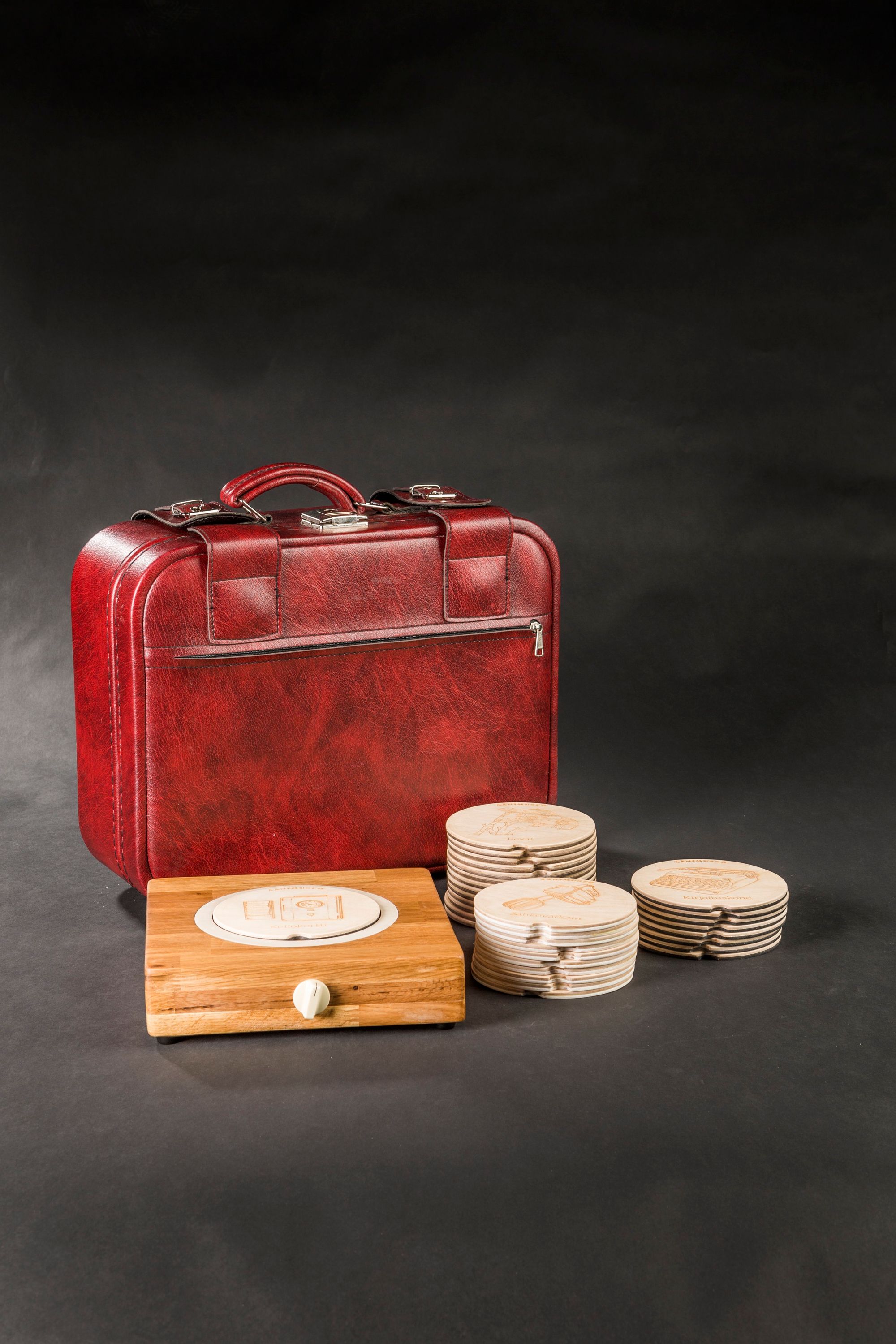 Äänimuseoiden versiot 4–8 toteutettiin siten, että laitteisto ja litteiksi vanerilevyiksi pienennetyt ja kuvitetut äänielementit pakattiin vaivatta mukana kulkeviin matkalaukkuihin (ks. kuva 4; Sirén 2017). Vanhainkodin lisäksi on kannettavilla äänimuseoilla pystytty palvelemaan aiempaa suurempaa asiakaskuntaa ikäihmisten palvelu- ja hoitotaloissa, päiväkeskuksissa ja korttelikerhoissa. TAITE:n toteuttama lainaustoiminta on tärkeä osa sitä inhimillistä tavoitetta, että kaikissa ikäihmisten asumis- ja palveluyksiköissä kulttuurinen toiminta olisi luonteva osa asukkaiden arkipäivää. Tähän helppokäyttöinen äänimuseo soveltuu hyvin.